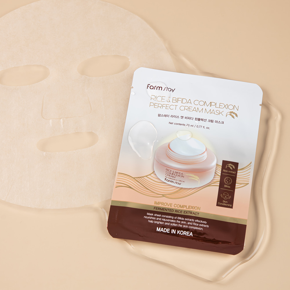 Η FARMSTAY Rice & Bifida Complexion Cream Mask είναι μια κορεάτικη μάσκα προσώπου σε μορφή sheet mask, ιδανική για όσες θέλουν άμεση λάμψη, βαθιά ενυδάτωση και εξισορρόπηση του τόνου της επιδερμίδας χωρίς κόπο 💖